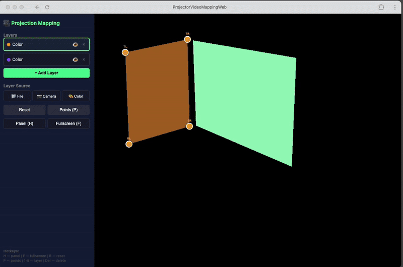 A powerful, browser-based projection mapping tool built with WebGL. Map videos, images, or live camera feeds onto any surface with precise 4-corner perspective correction. No installation required—just open and create.